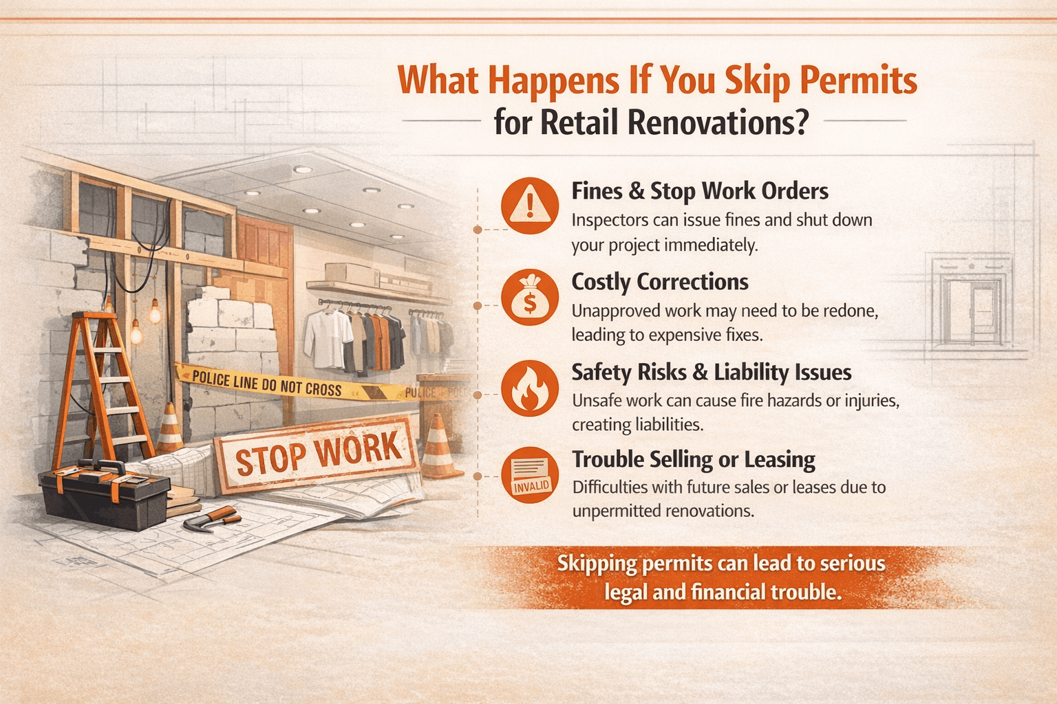 Without proper permits, projects can face serious issues. You may deal with stop-work orders, failed inspections, or delays in opening. In some cases, completed work may even need to be removed.